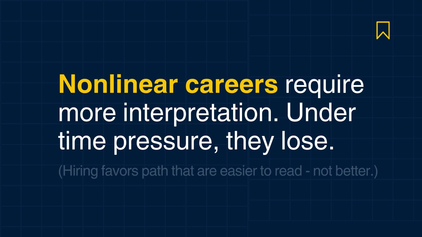 This is where capable candidates with unconventional paths get lost. Not because an algorithm rejected them, but because human screeners under cognitive load default to easily recognizable patterns. You're not making it past human judgment operating at scale, and that judgment favors clarity over depth.
